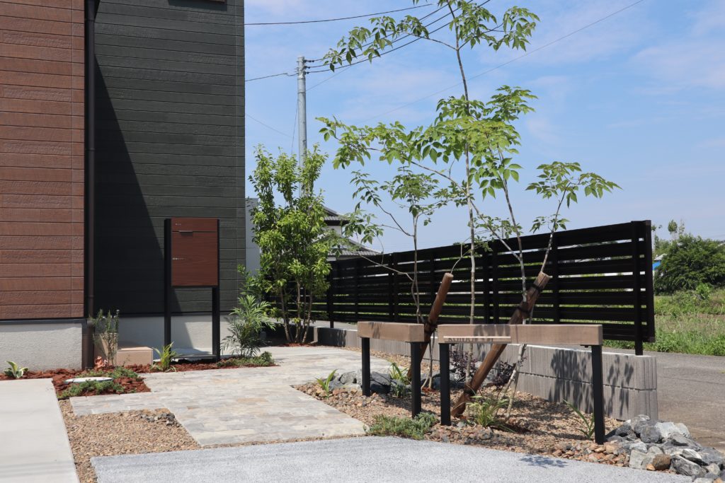 天然素材の温かみと植栽の緑が調和した、ナチュラルで居心地の良い外構になりました。
