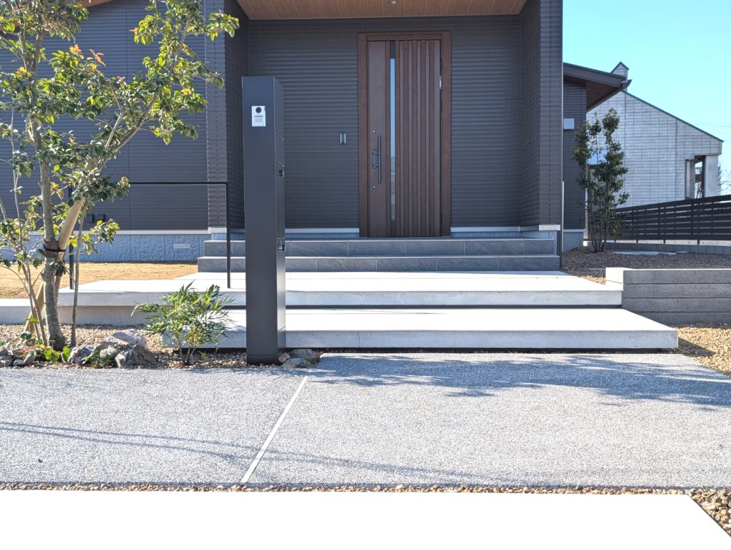 グレートーンで統一された外構が、建物の魅力を引き立てています。I様、ありがとうございました。